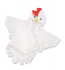 -White spa towel with attached ties, flappy, 3-D wings, embroidered orange beak and black eyes, and a crimson, 3D "comb" on top