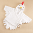 "Barnyard Bathtime" Chicken Hooded Spa Robe. Whoever gets a visit from this eggs-traordinary chick is one clucky newborn! Talk about taking a little one under your wing! Baby Aspen's chicken spa robe is making a big splash during every barnyard bathtime! Features and facts: White spa robe with attached ties, flappy, 3-D wings, embroidered orange beak and black eyes, and a crimson, 3D "comb" on top. Machine-washable terrycloth. Size 0-9 months.
