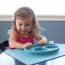 The ezpz The Happy Mat Silicone Placemat + Plate that suctions to the table, which means that it captures the mess and eliminates tipped bowls and plates. The Happy Mat's three compartments remind parents to serve a fruit or veggie, protein and carbohydrate and the smiley face design puts kids in the right mood for a positive mealtime experience.